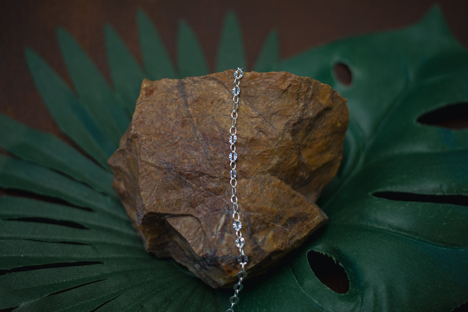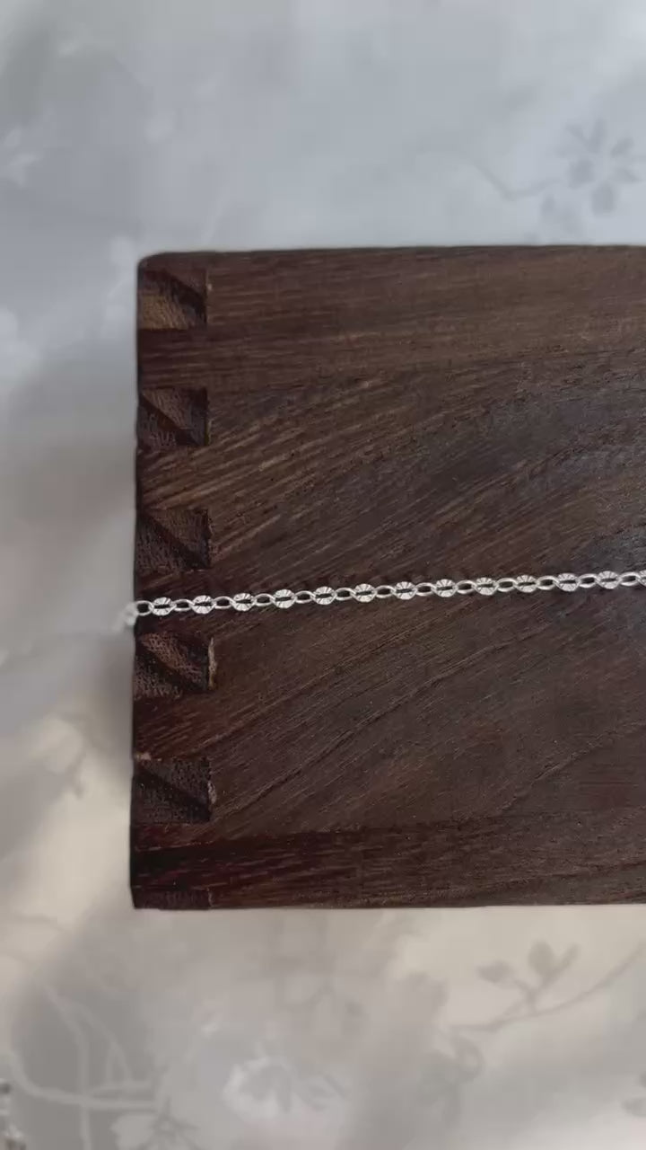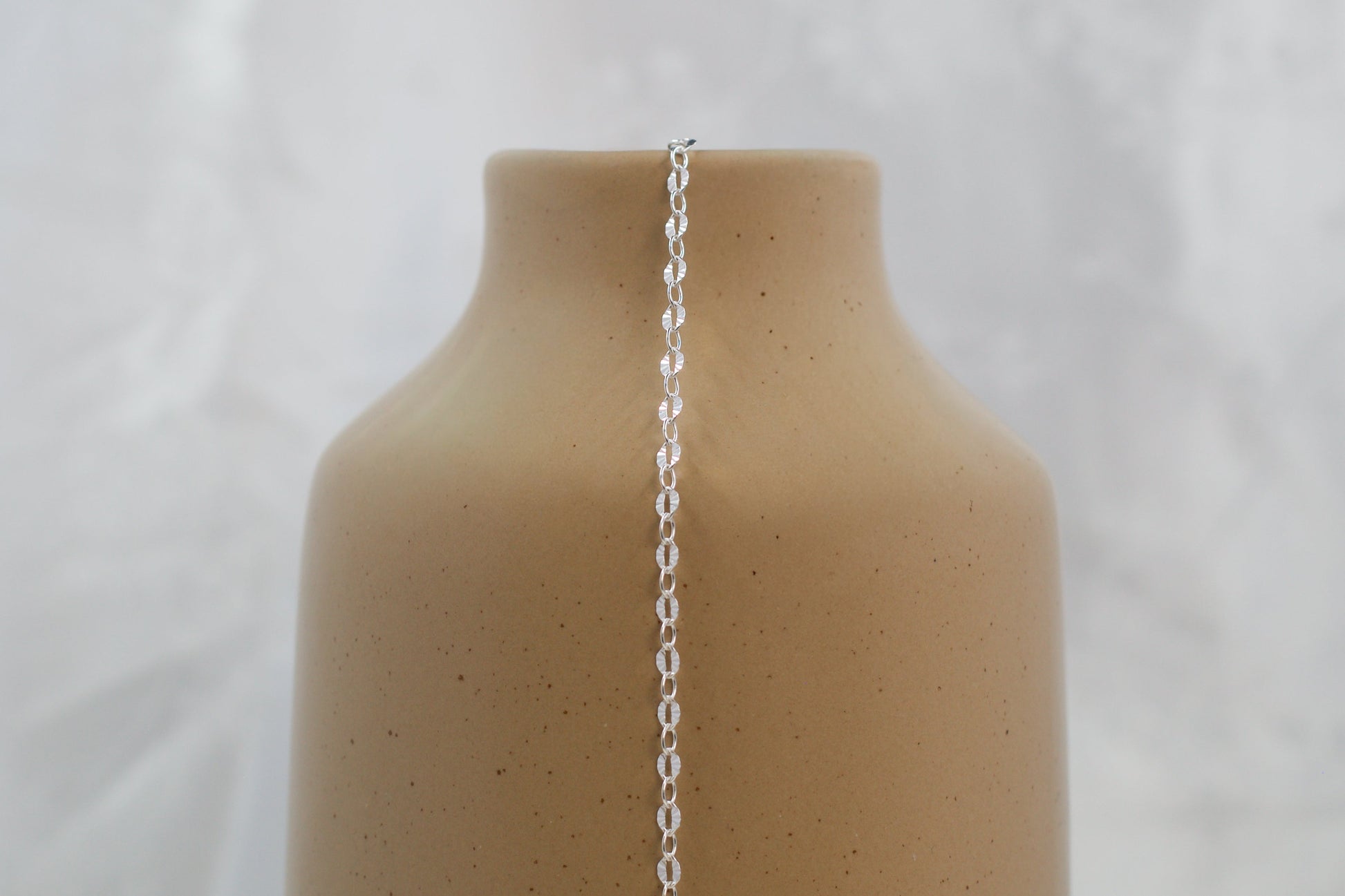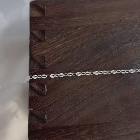 Delanie features a sterling silver dual-link design combining a pressed, embossed cable chain with a micro paperclip chain for refined texture and contrast. This durable chain blends intricate detail with modern elegance — an ideal choice for creating elevated jewelry pieces with a sophisticated, layered look.