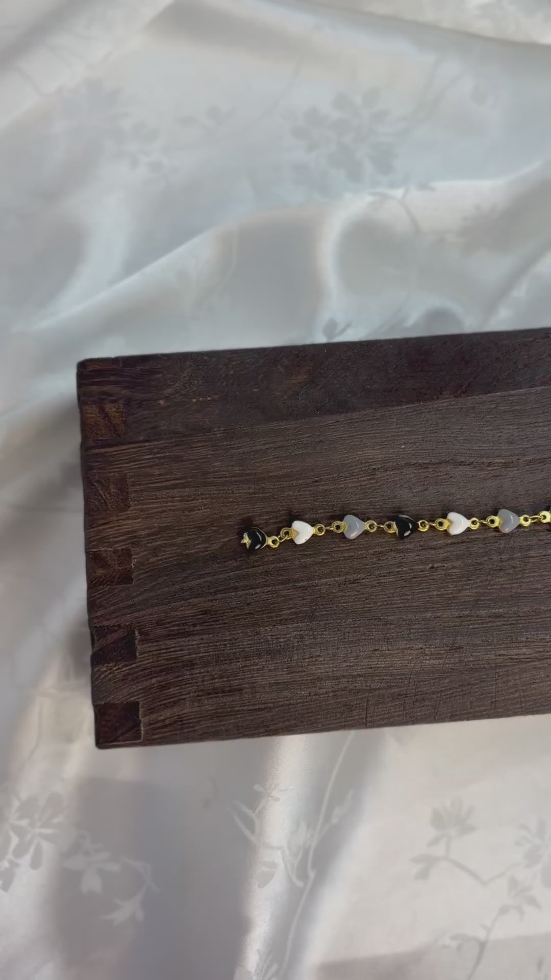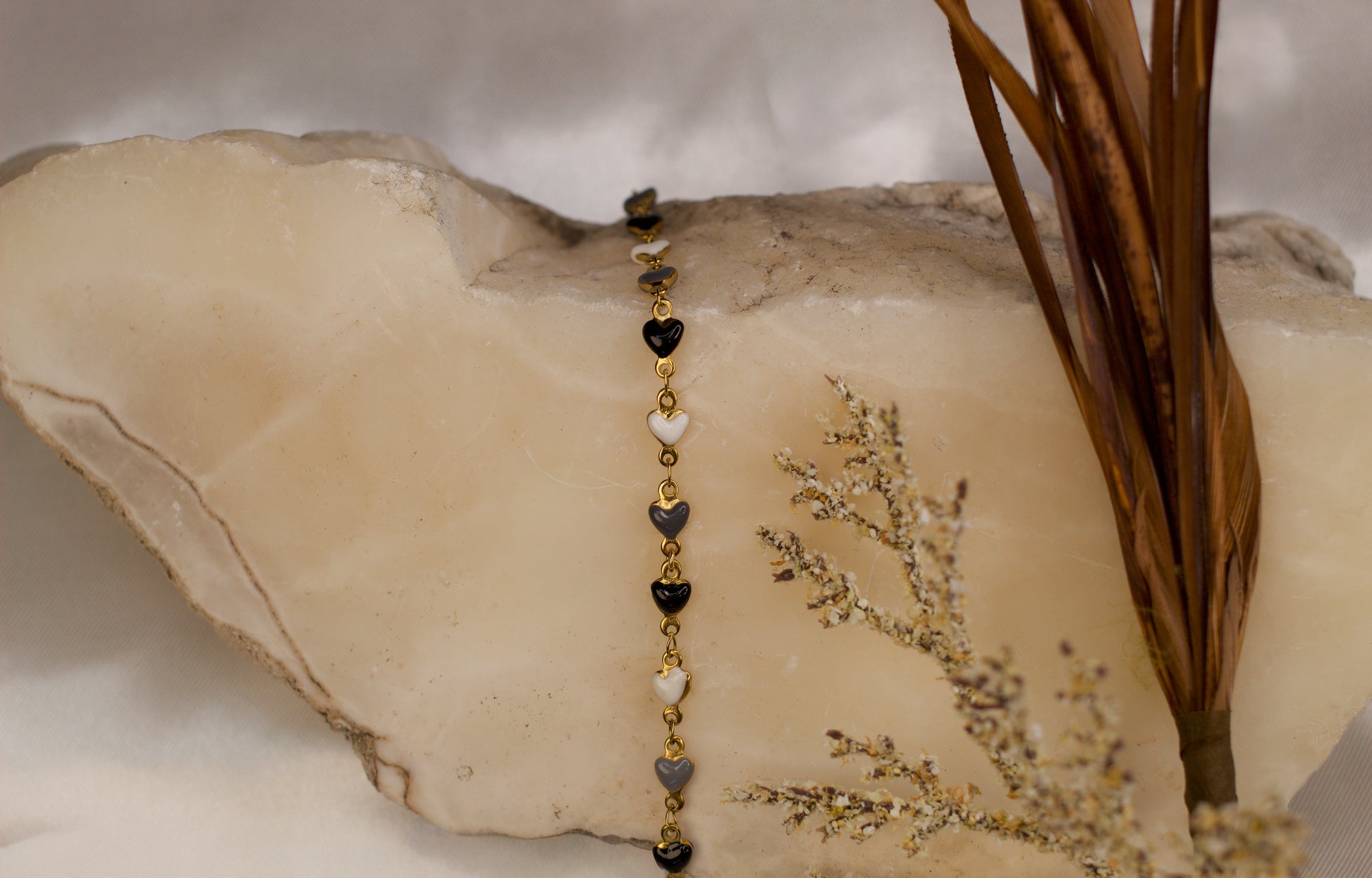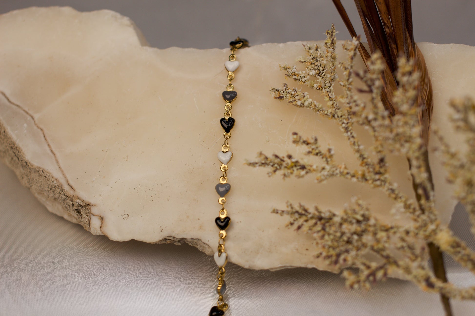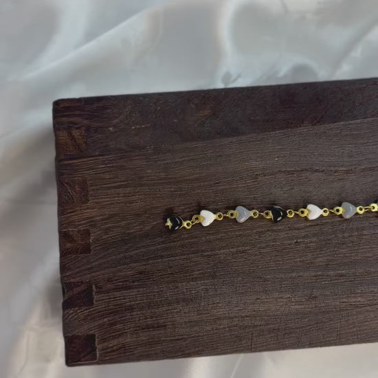 Faye features PVD gold-plated stainless steel heart links filled with enamel in shades of grey, black, and white. Crafted for durability and lasting shine, this refined chain combines contrasting tones and textures — perfect for creating sophisticated jewelry pieces with timeless style.