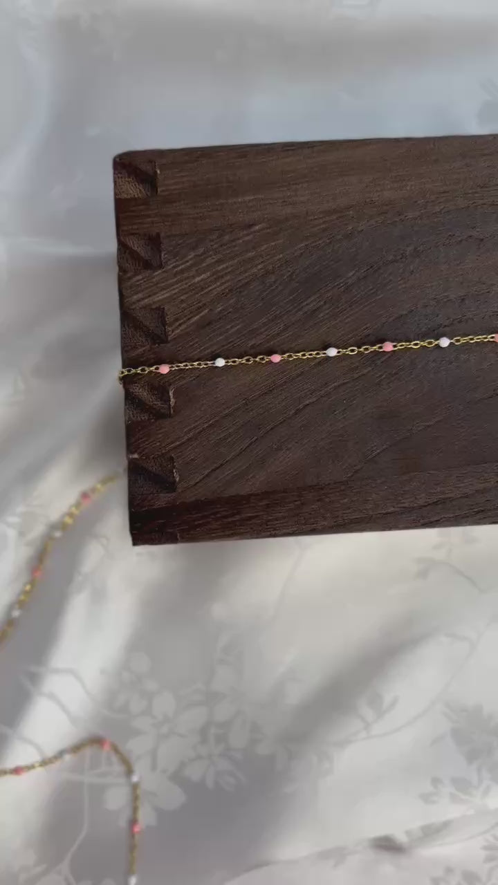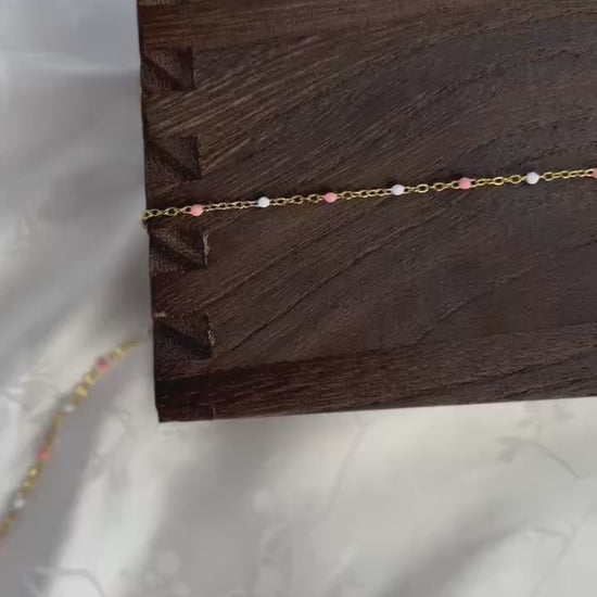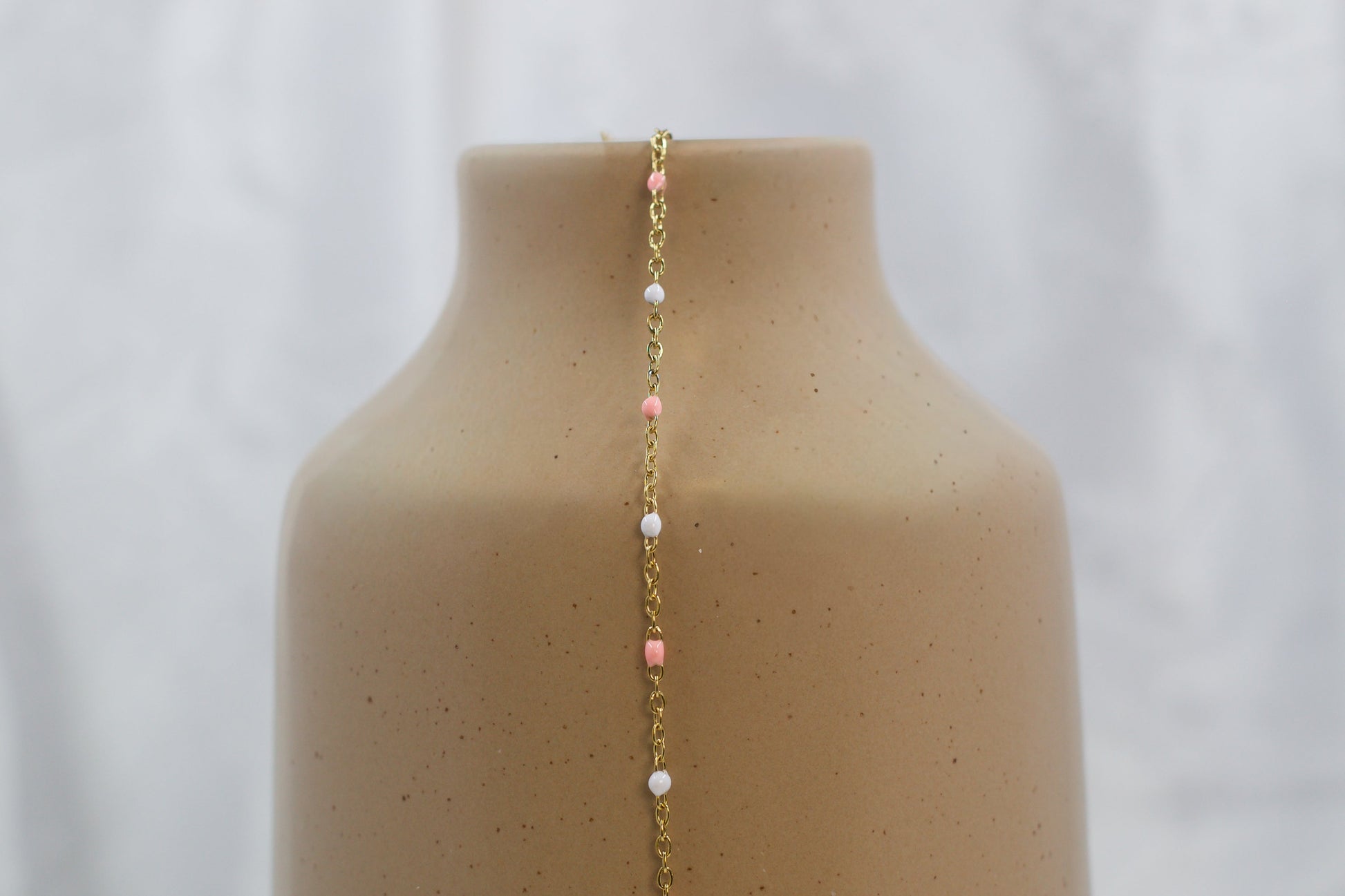 Georgia features a PVD gold-plated stainless steel chain accented with soft peach and white enamel beads for a warm, feminine touch. This durable chain blends gentle color with a luminous finish — an ideal choice for creating elegant, everyday jewelry pieces with a subtle pop of warmth.