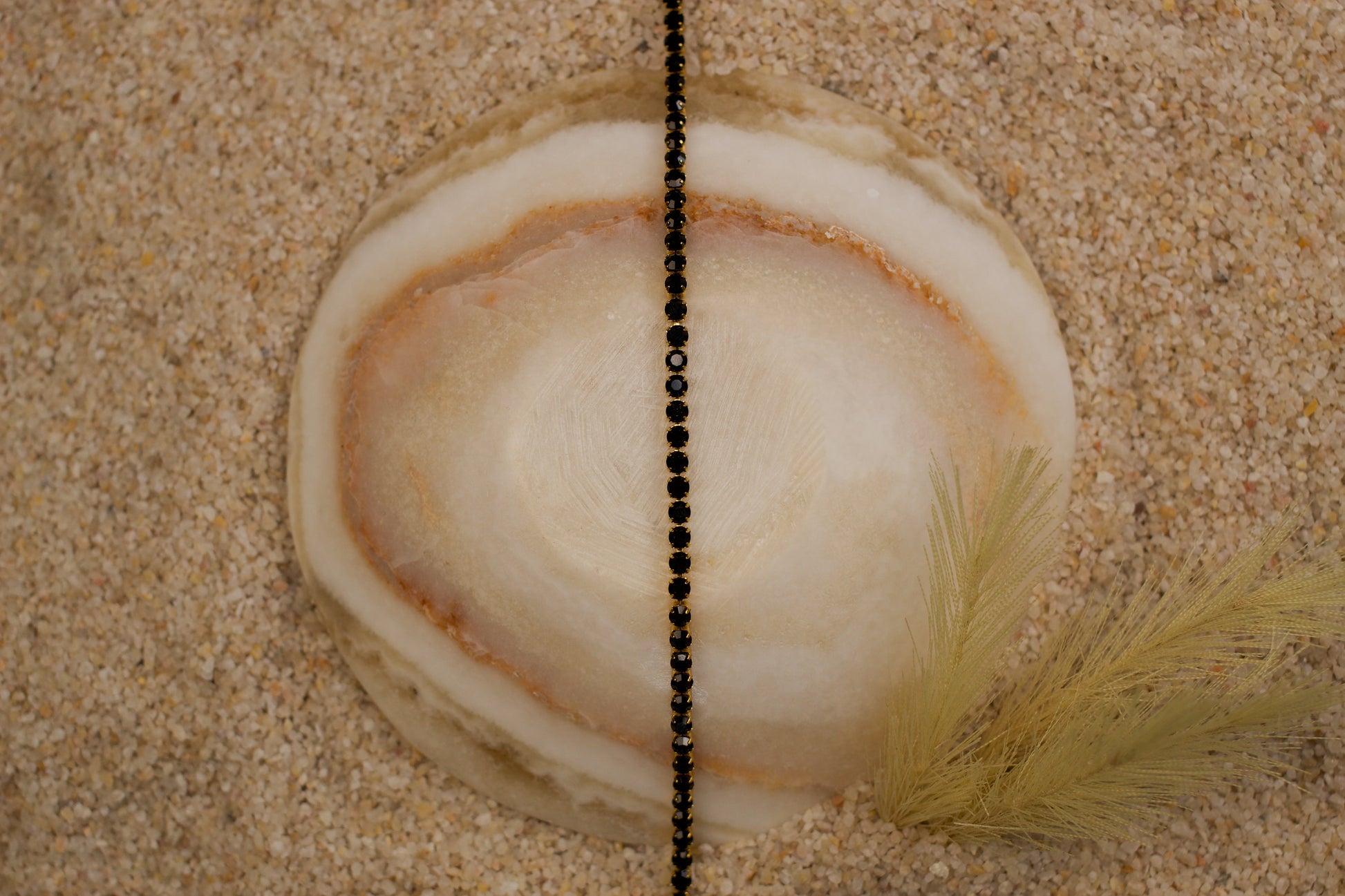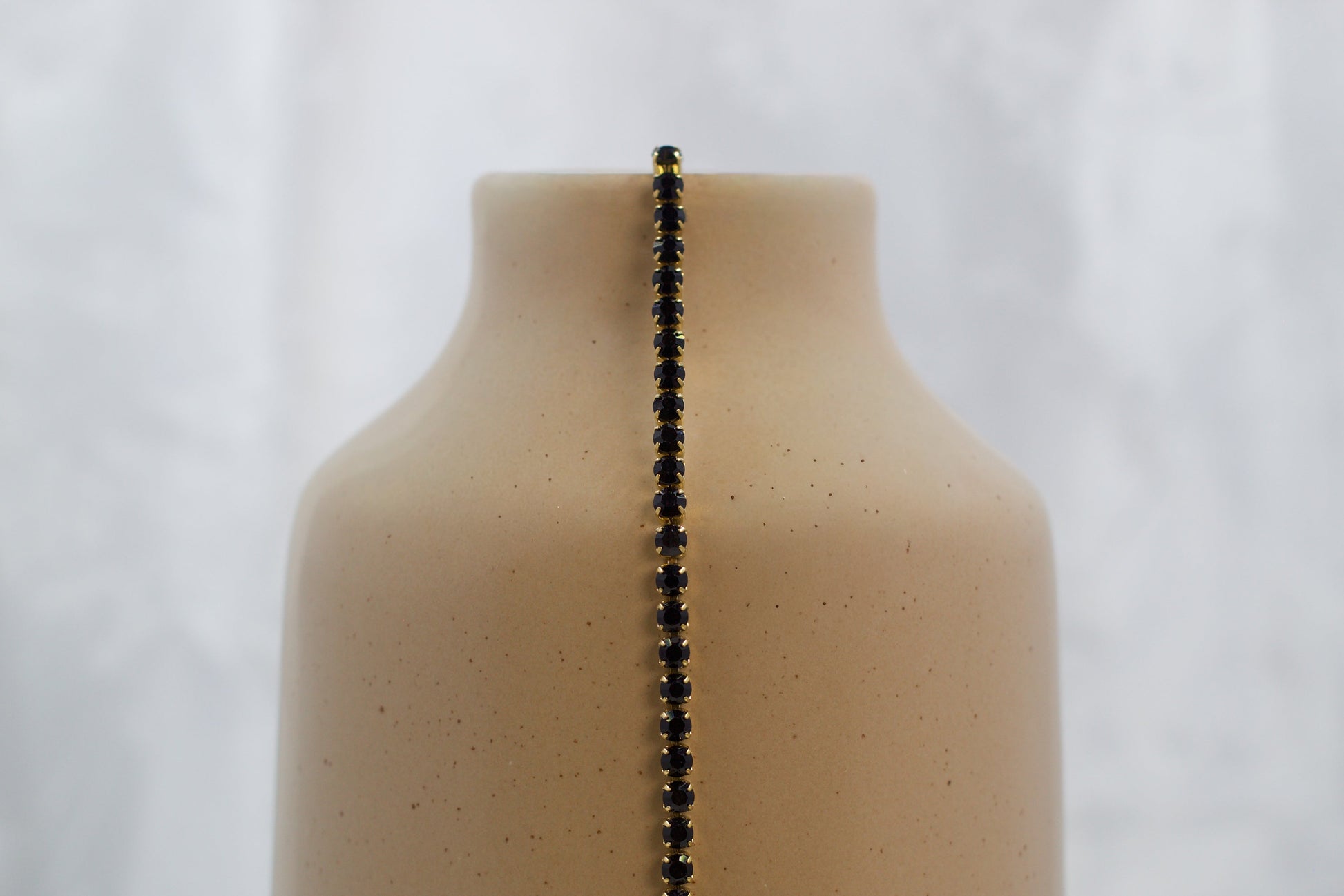 London features a PVD gold plated tennis chain accented with black rhinestones for a sleek, high-contrast look. This durable chain delivers refined shine with a dark, modern edge — an ideal choice for creating elevated jewelry pieces that feel bold, polished, and timeless.