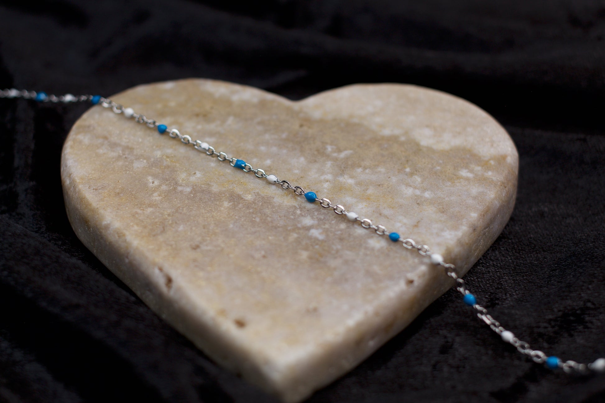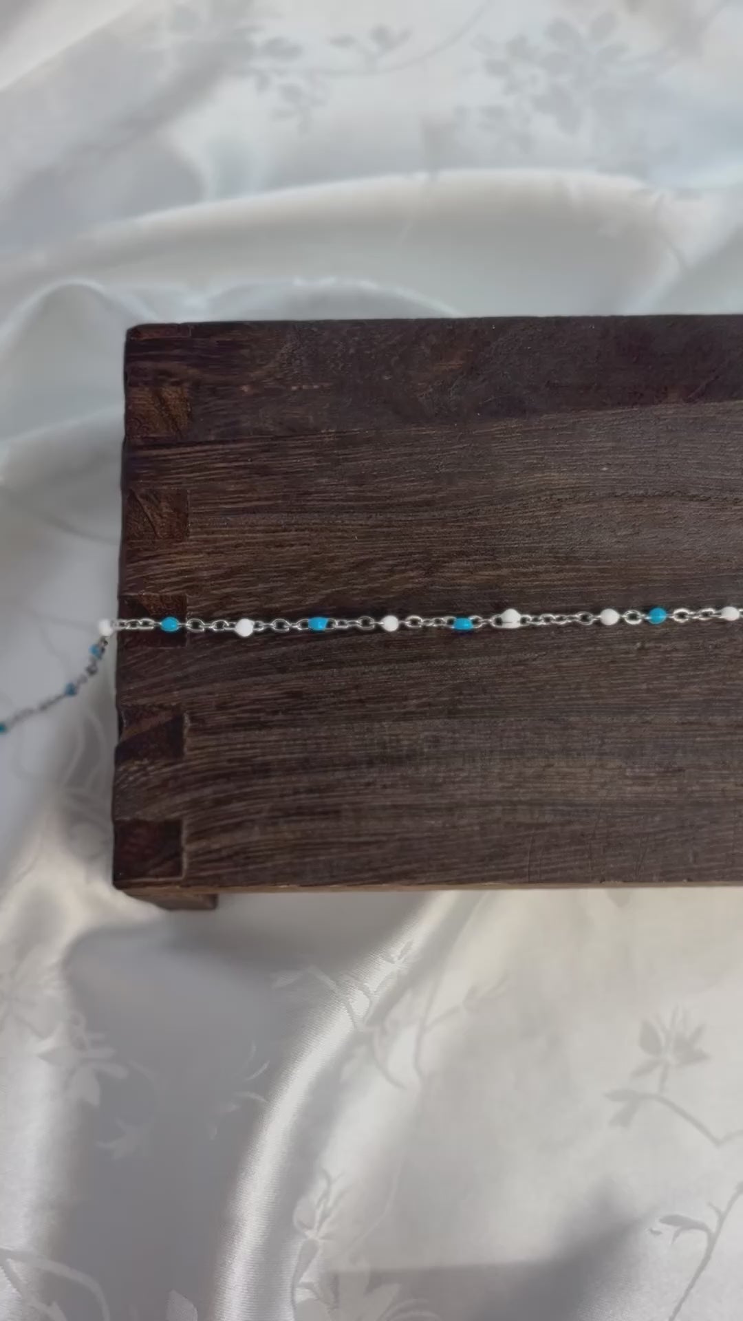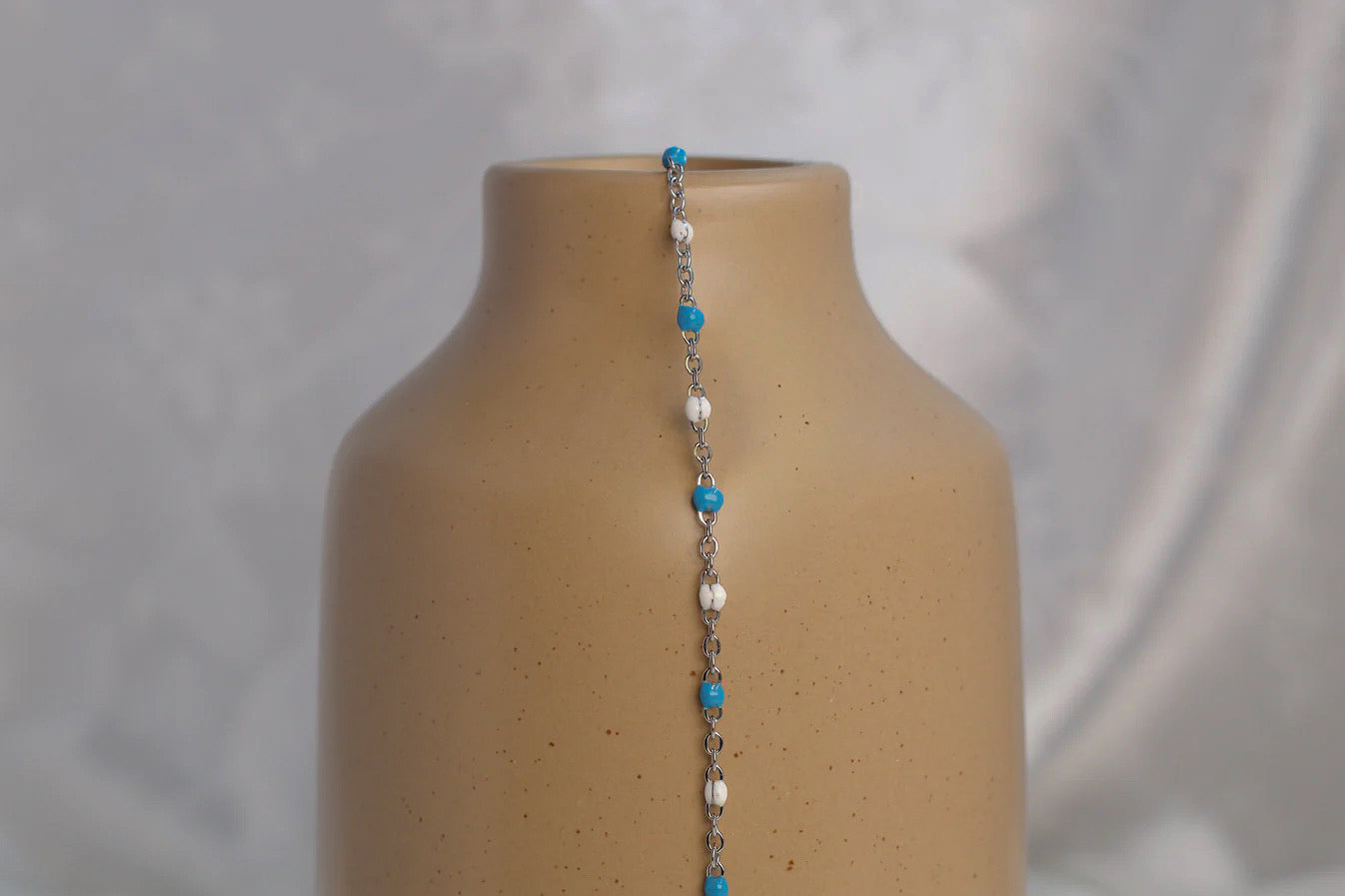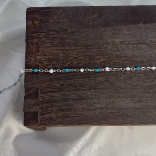 Madeline features a PVD stainless steel cable chain accented with white and blue enamel beads for a fresh, timeless look. This durable chain blends soft color with a sleek, modern finish — an ideal choice for creating refined, everyday jewelry pieces with a subtle pop of color.