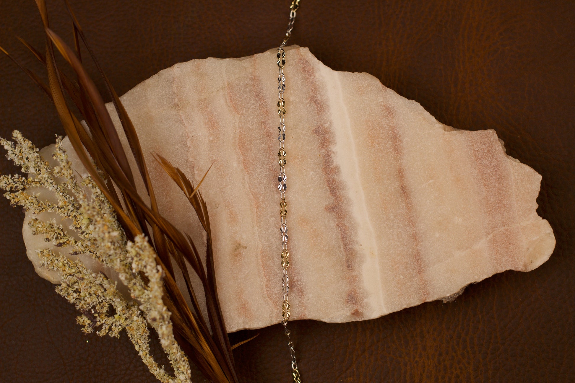 McKenna features a mixed-metal chain crafted with sterling silver and gold-filled pressed, embellished patterned links for a refined, eye-catching design. This durable chain blends texture, shine, and contrast — an ideal choice for creating elevated jewelry pieces with timeless sophistication and unique detail.