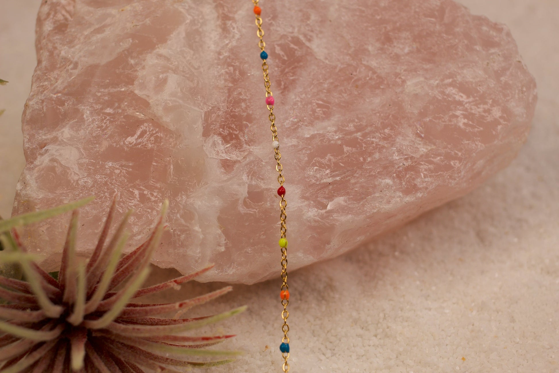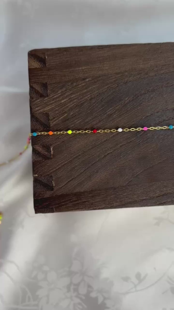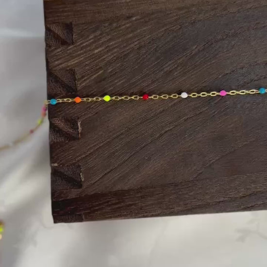 Oakley features a PVD gold-plated stainless steel chain accented with enamel beads in vibrant shades of pink, blue, orange, yellow, red, and white. Tarnish-resistant and hypoallergenic, this durable design combines modern color with lasting shine — ideal for creating stylish, everyday jewelry pieces with a polished finish.