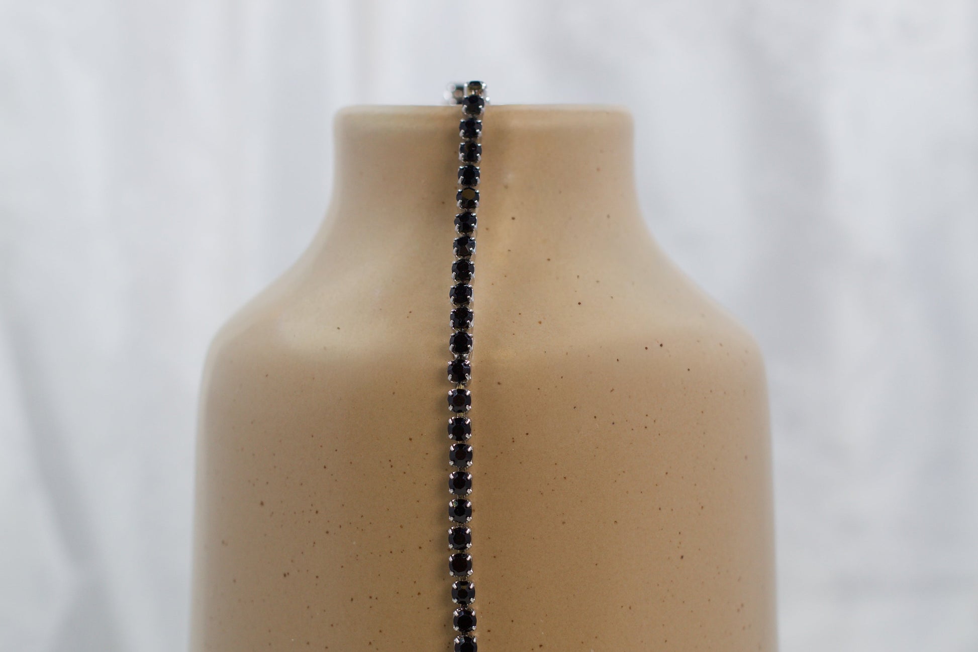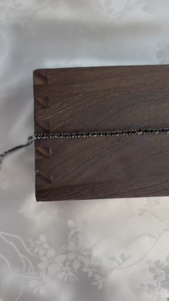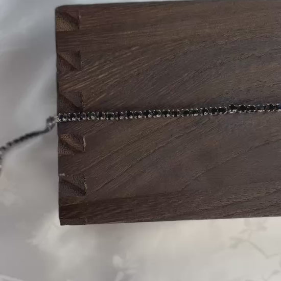 Onyx features a PVD stainless steel tennis bracelet accented with sleek black rhinestones for a bold, high-contrast look. This durable bracelet blends refined sparkle with dark elegance — an ideal choice for creating statement jewelry pieces that feel modern, powerful, and timeless.