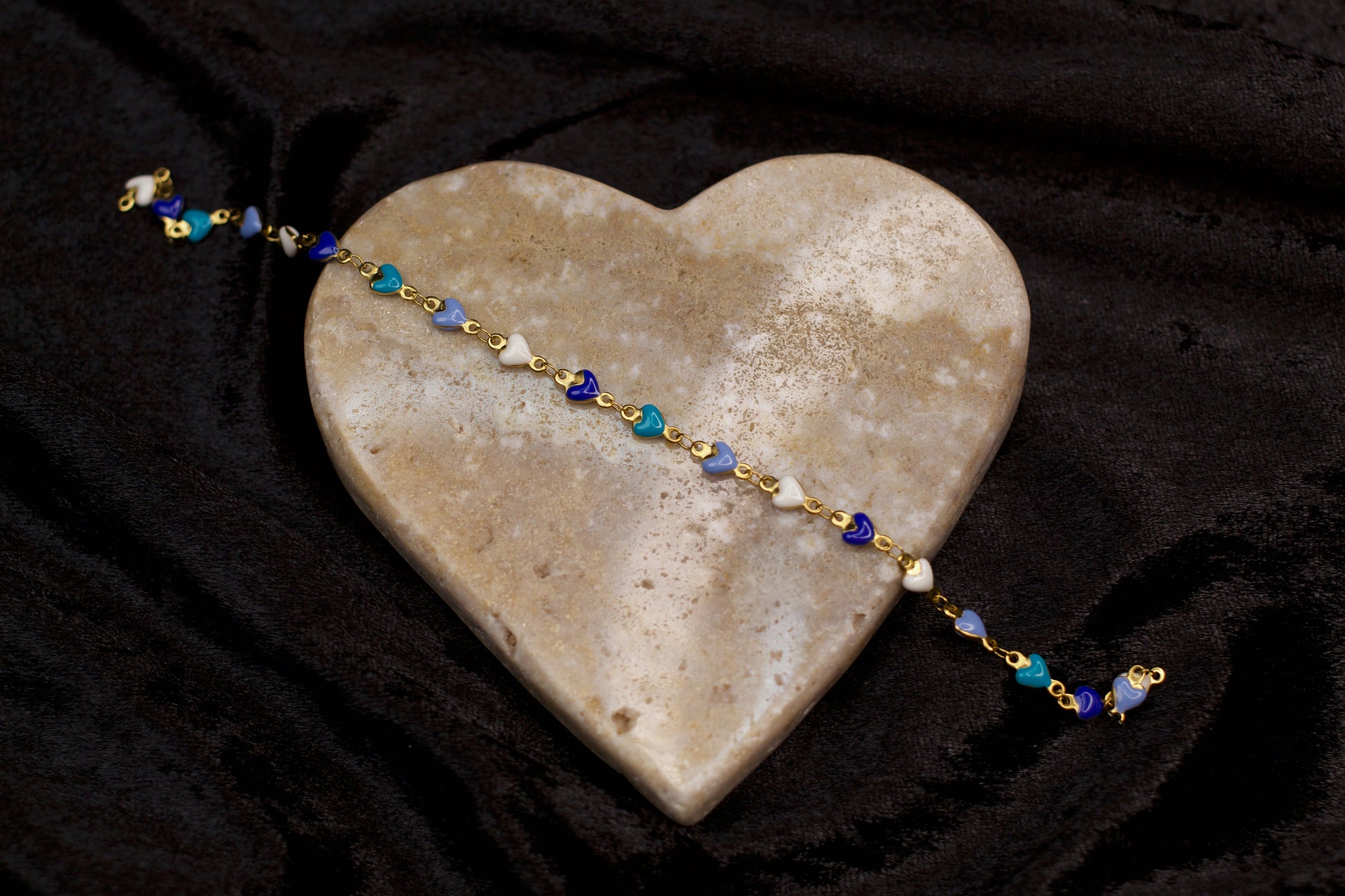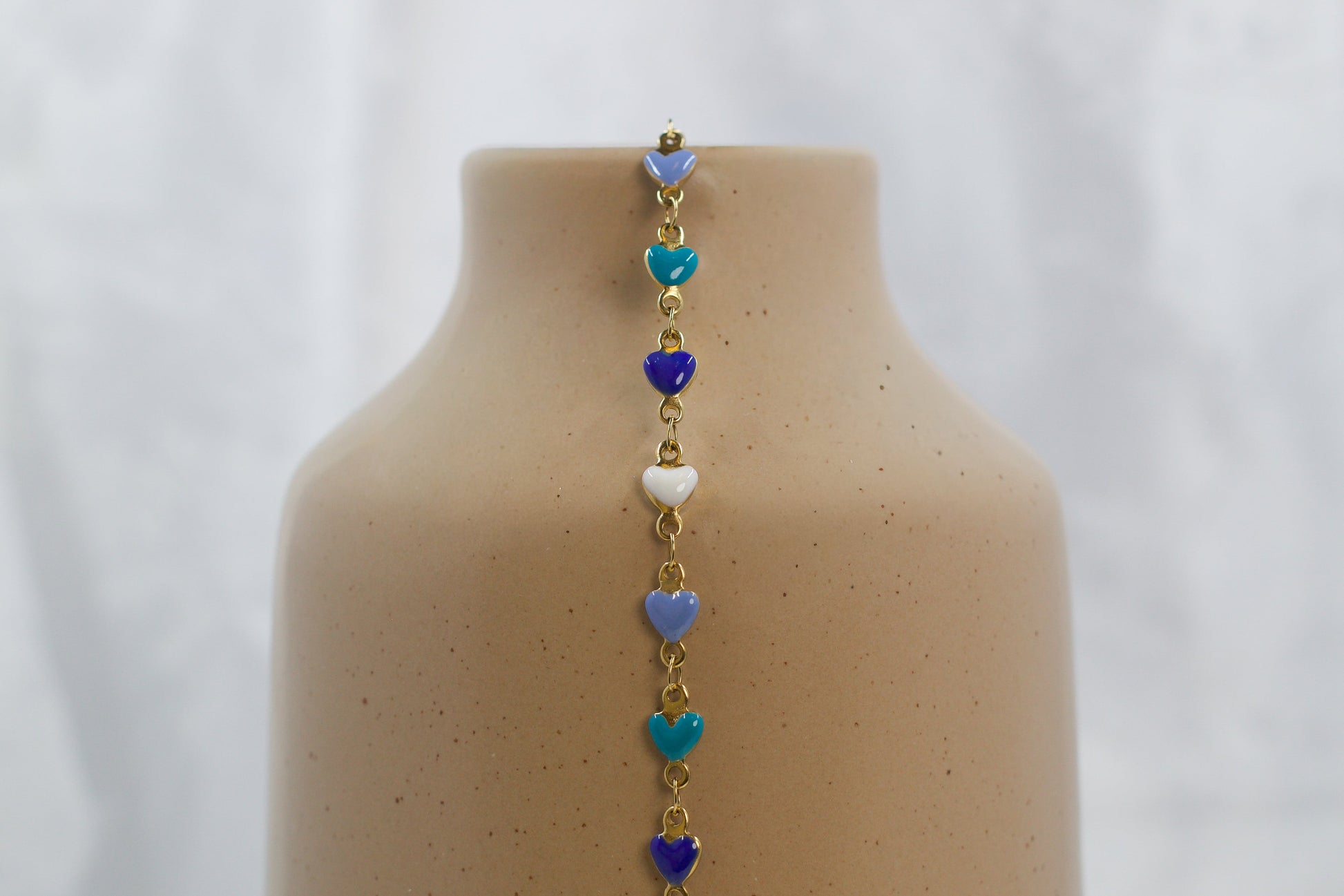 Rayne features PVD gold plated stainless steel heart-shaped links coated with enamel in navy, teal, light blue, and white. Crafted for durability and shine, this colorful chain adds a whimsical touch and vibrant personality — perfect for creating fun, expressive jewelry pieces with joyful style.