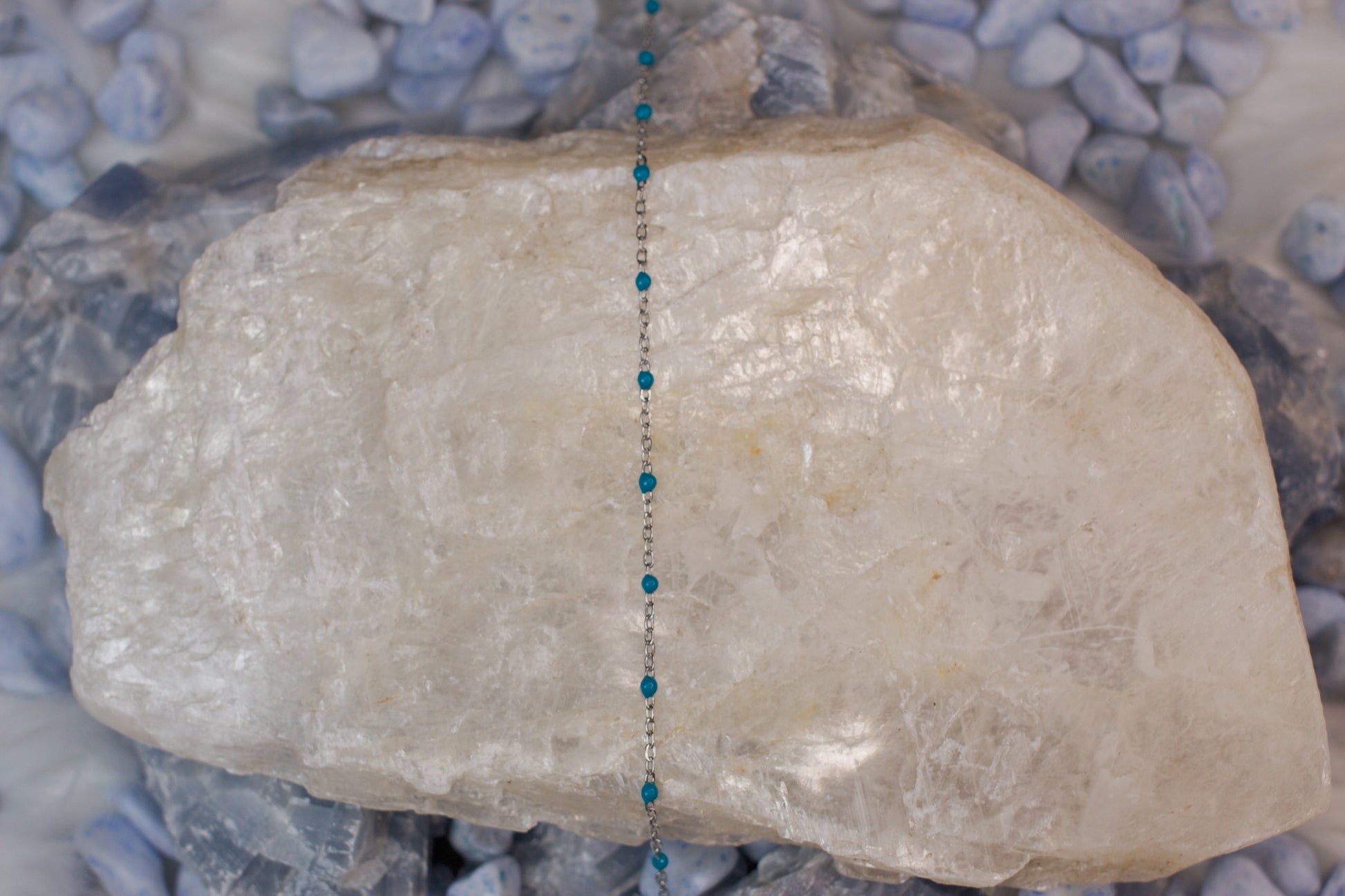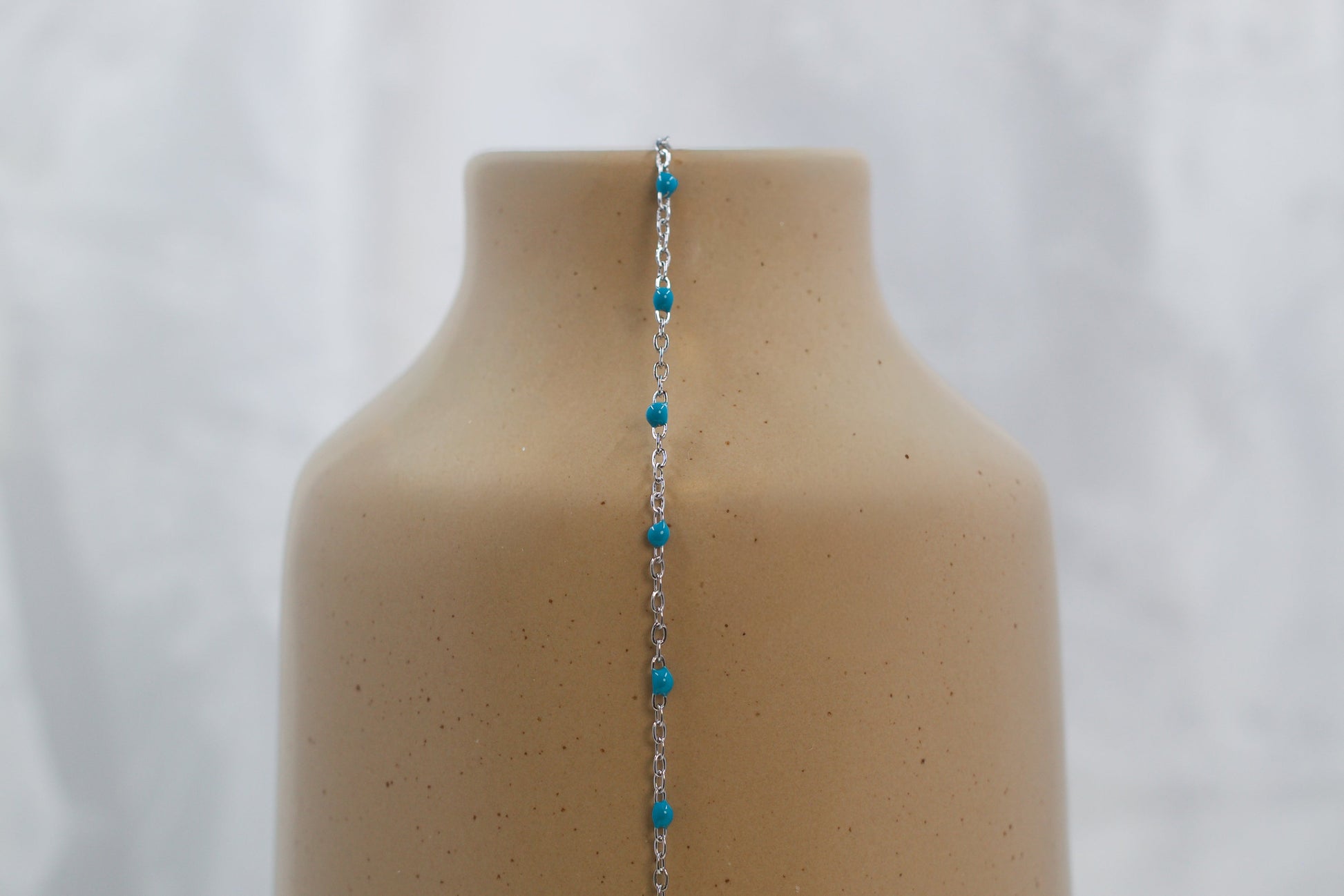 River features a PVD stainless steel cable chain accented with deep teal enamel beads for a rich, moody pop of color. This durable chain blends a sleek, modern finish with natural depth — an ideal choice for creating refined jewelry pieces with a grounded, effortless edge.