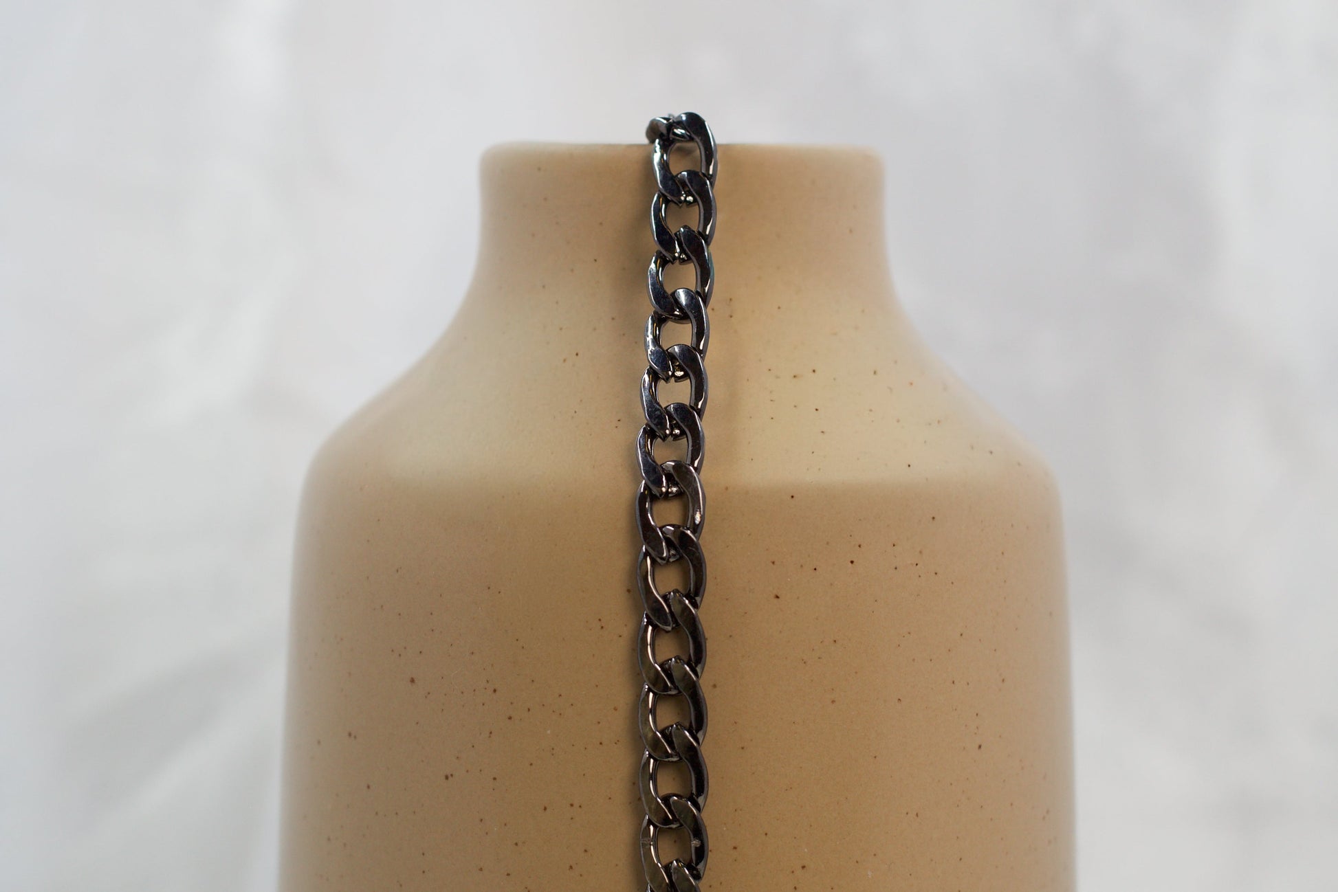 Shadow features a bold, oversized Cuban chain crafted from PVD stainless steel with a sleek gunmetal black coating. This durable chain delivers a powerful, high-impact look with a smooth, polished finish — an ideal choice for creating statement jewelry pieces with a dark, modern edge.